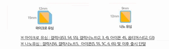 ※ 유심 표면의 금속 단자가 사각형 혹은 원형 등으로 다른 형태를 보이기는 하지만, 유심의 출시일과 제조사의 제품 디자인이 다르기 때문이며, 기본 기능은 동일합니다. 유심을 장착하는 슬롯의 형태와 크기는 표준 규격을 준수해야 합니다.