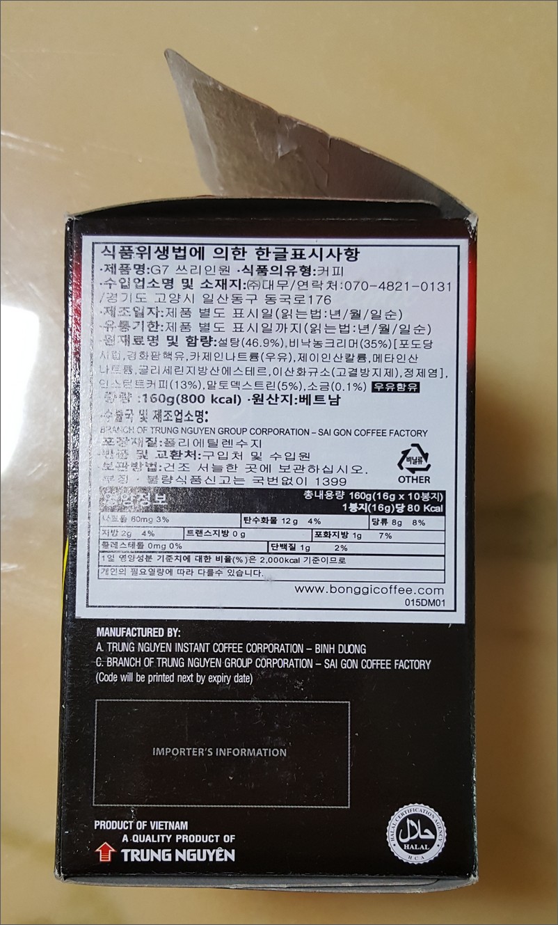 1개의 총중량과 사용한 커피의 양만을 비교하면 G7 3in1의 가격이 높은 것이 당연하겠지만 그래도 연아의 커피가 국산이라는 것과 베트남에서 제조한 제품의 평가 절하 요소를 고려했을 때 예상외로 단가 차이가 많이 납니다. 베트남의 경제력이 상승하면서 국가 이미지가 좋은 반응을 얻고 커피 가격도 오른 것으로 보입니다.