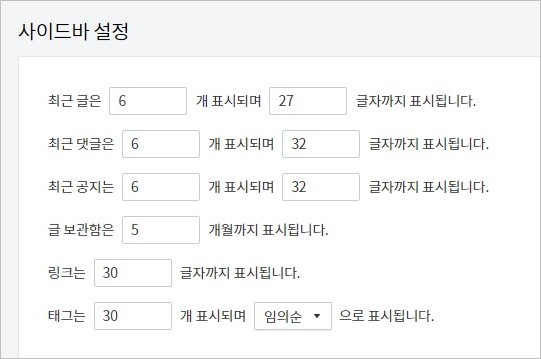 공지사항, 최근 글, 최근 댓글의 표시 길이를 조절할 수 있습니다.