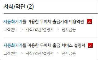 페이지를 띄우고 중간쯤 내려가면 "자동화기기를 이용한 무매체 출금거래 "이용약관"과 "서비스 설명서" PDF 파일을 다운로드할 수 있습니다. 이용 시간과 수수료 관련 내역은 "서비스 설명서"를 참고합니다.