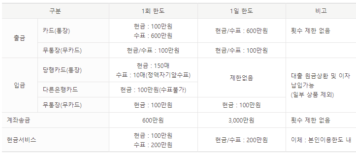 ▪ 무매체 출금 서비스 이용 한도는 계좌별 자동화기기 이용 한도 내에서 1 회 100만 원, 1 일 100만 원까지 이용 가능합니다. (다만, 자동화기기 이용 한도를 무매체 출금 서비스 이용 한도 범위 내로 개별 약정하는 경우에는 개별 약정된 범위 내에서 무매체 출금 가능)