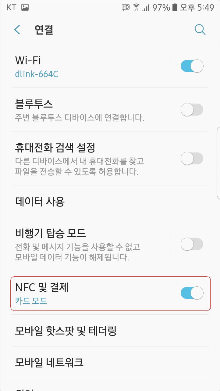 기본모드를 켜면 NFC의 모든 기능을 사용할 수 있습니다.