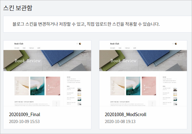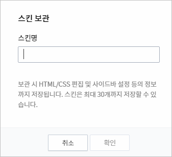 '사용 중인 스킨'의 옆에 '보관' 버튼을 눌러 '스킨 보관' 팝업창이 뜨면 원하는 스킨명을 입력하고 '확인' 버튼을 눌러 현재 사용 중인 스킨 코드 파일과 설정 파일들의 백업을 실행합니다. 티스토리 서버에 백업되는 것입니다. 내 컴퓨터 아닙니다.