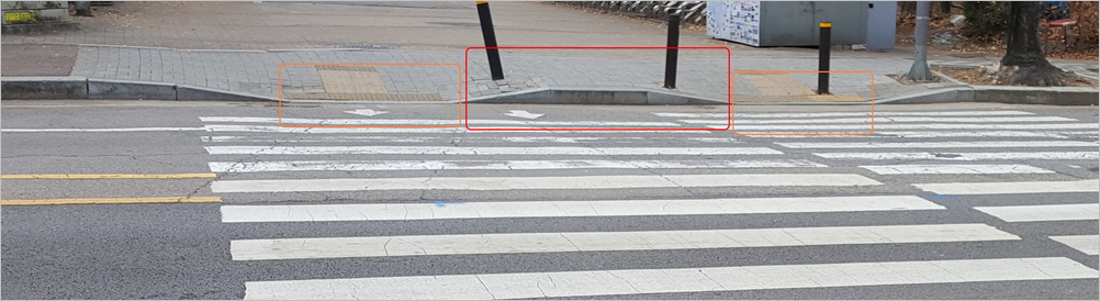 이 사진은 인근의 횡단보도입니다. 봉을 설치하기는 하였지만 그나마 인도와 도로의 경계선을 평탄하게 시공하였습니다. 보행자가 횡단보도를 모두 사용할 수 있으며 낙상 사고가 발생하지 않습니다.