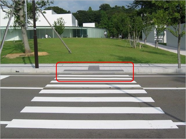 이 횡단보도는 공원 안쪽으로부터 이어지는 인도와 도로가 완전히 일치하는 평지입니다. 매우 편안하고 안정된 느낌을 주고 자동차 도로와 맞닿은 인도의 시작 지점(빨간색)부터 끝 지점까지 높이를 낮추어 지면을 평탄하게 만들었습니다.