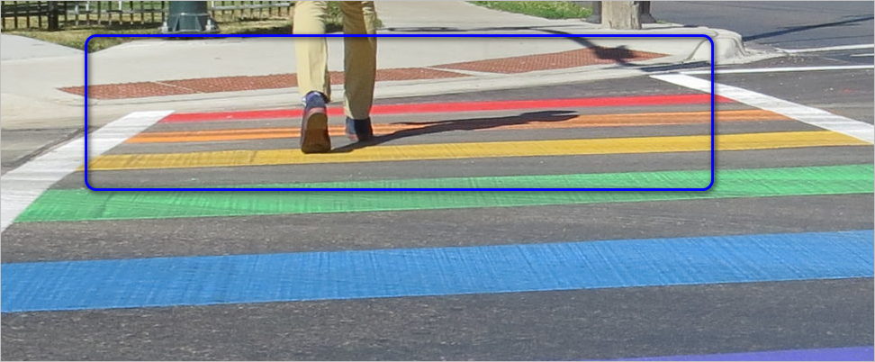 횡단보도를 올바르게 설치한 미국의 사례입니다. 보행자 안전지대를 무지개색 페인트로 표시한 폭만큼 경계선을 평탄하게 시공하고 시각장애인용 보도블록을 가설하였습니다.