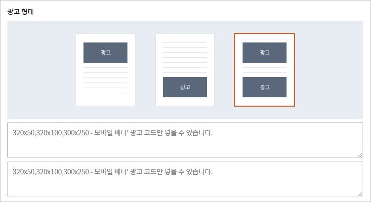 '상단과 하단'을 선택하게 되면 2개의 입력 칸이 제시됩니다. 내부 글을 자세하게 확인합니다. "320x50, 320x100, 300x250" 3가지의 모바일 배너 광고만 넣을 수 있습니다.