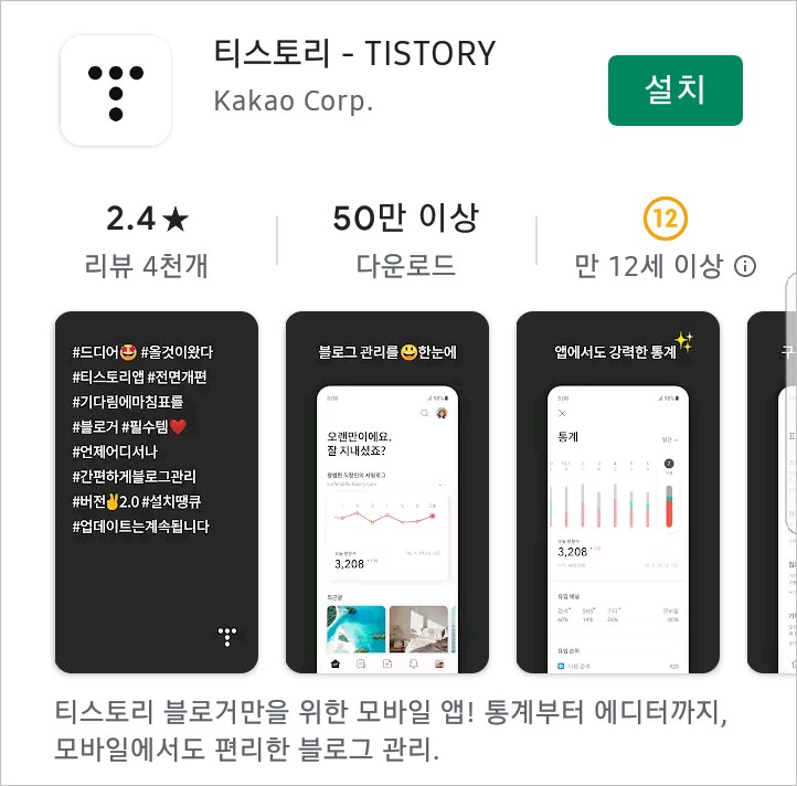 블로그에 PC 혹은 모바일 웹 브라우저를 사용하여 접근할 때에는 광고가 정상적으로 구현되지만, 구글 플레이스토어에서 설치하는 티스토리(TISTORY) 모바일 앱을 실행하여 블로그에 접속하면 본인이 등록한 광고가 보이지 않는 현상이 일부 블로거에게 발생할 수 있습니다.