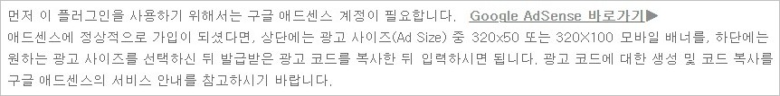- '블로그 관리 홈' / '플러그인' / '구글 애드센스(모바일)' 의 본문 글에 링크가 있습니다.
