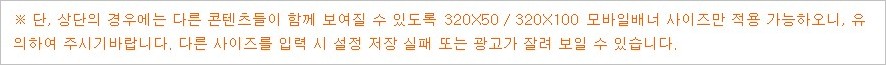 '상단과 하단'을 선택하게 되면 2개의 입력 칸이 제시됩니다. 내부 글을 자세하게 확인합니다. "320x50, 320x100, 300x250" 3가지의 모바일 배너 광고만 넣을 수 있습니다.