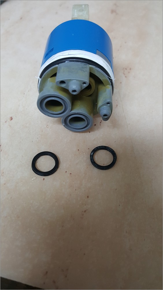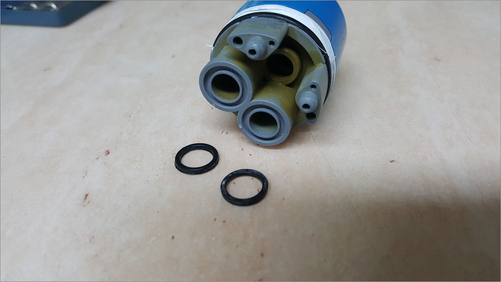 작은 2개의 고무 패킹은 온수와 냉수 유입구의 누수를 차단하는 역할을 하고, 직경이 큰 고무 패킹은 카트리와 수전 본체의 틈을 막는 역할을 합니다.