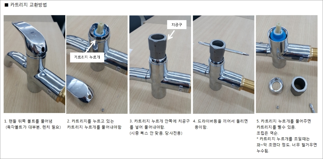 [이미지 출처] 로얄앤컴퍼니, 고객센터, "수전 누수 시 카트리지 교환하는 방법"