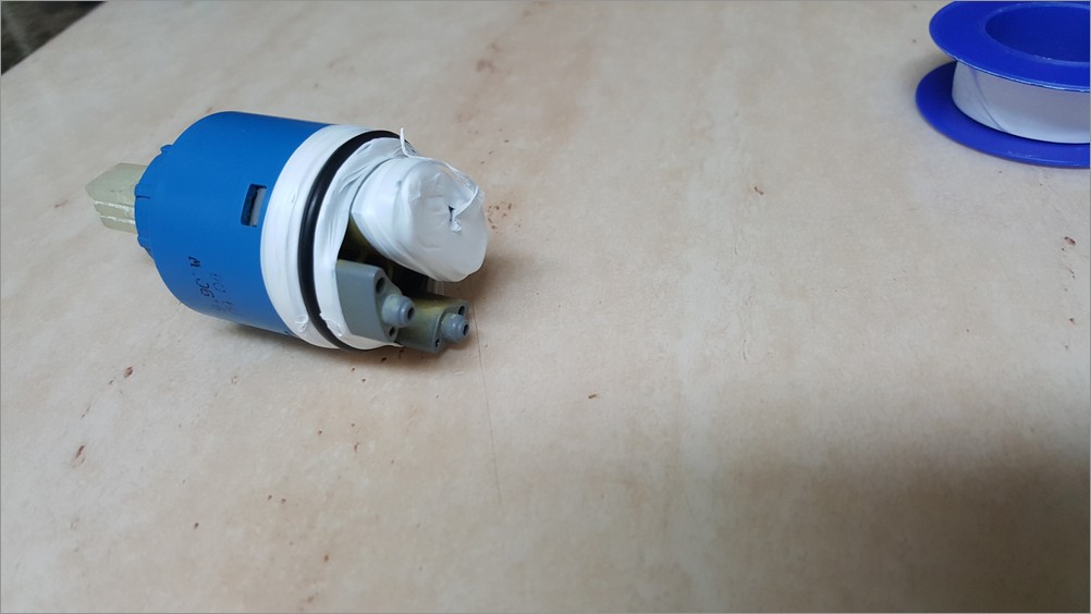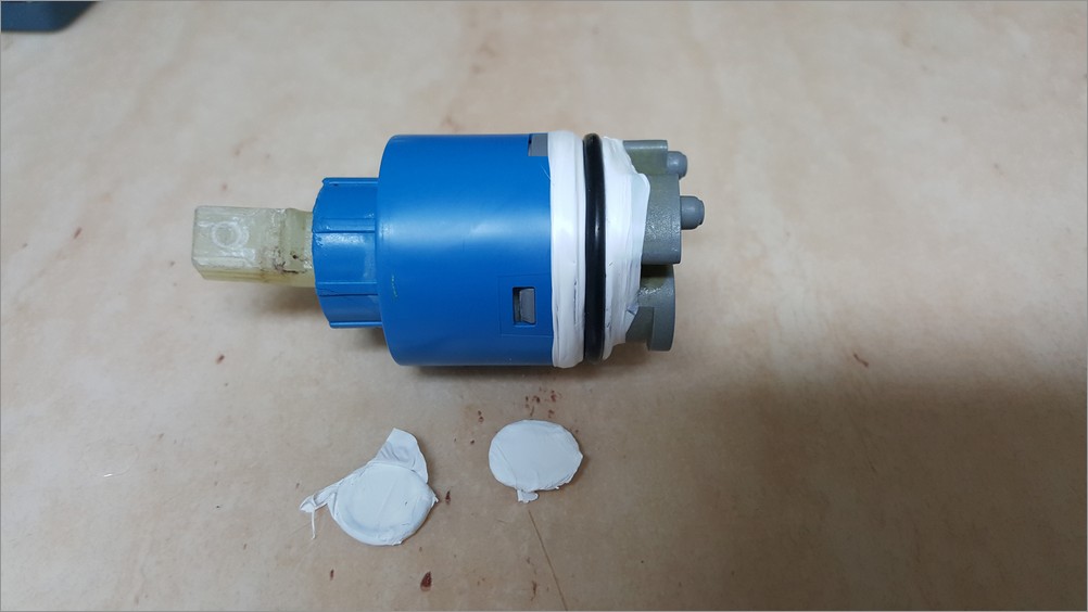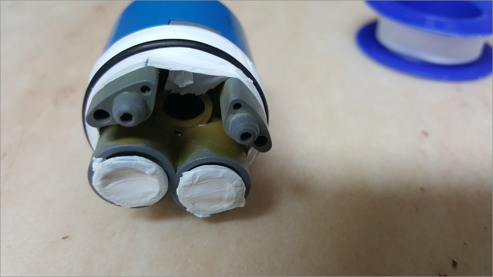 원래 제품에는 이 부분에 패킹이 없었으니까 필요 없는 작업일 수 있지만, 아래 사진처럼 카트리지 상단을 테플론 테이프로 보강하여 카트리지 누르개를 덮으니까 카트리지가 수전 본체에 안정적으로 장착이 되고 누수 방지에도 도움이 되는 것 같습니다.