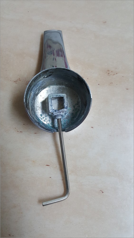 카트리지를 덮고 있는 카트리지 누르개를 분리할 차례입니다. 로얄 수전의 경우 "치공구"라는 도구가 필요합니다. 로얄의 카트리지 누르개는 자사 규격에 맞게 외부가 아닌 내부에 6각 요철 형태로 제작하였기 때문에 로얄에서 제작한 치공구를 사용해야 분리가 가능합니다. 수전의 외관을 손상시키지 않으려면 반드시 필요합니다. RLS100AR6의 규격에 맞는 치공구는 15,000원 정도입니다. 카트리지만 구입하면 배송비 별도로 1만 원 내로 구입이 가능합니다.
