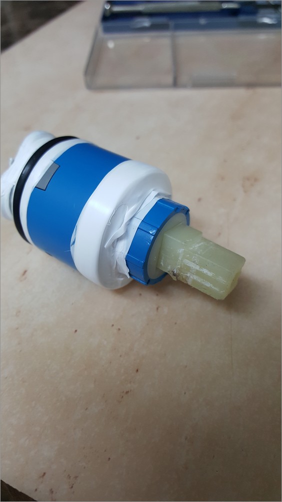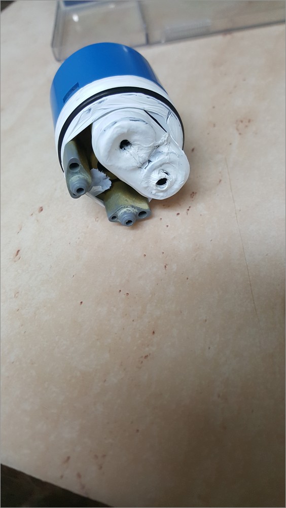 카트리지 내부에 조립된 세라믹 재질의 수로 덮개가 오랜 사용으로 미세하게 마모될 수 있기 때문에 파란색 카트리지 상부 부품을 좀 더 밀착시키기 위하여 이런 작업을 추가한 것입니다.