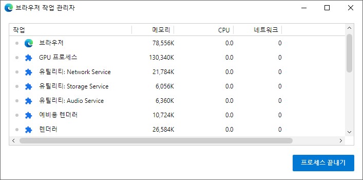 '브라우저 작업 관리자'를 실행하여 Microsoft Edge 브라우저가 진행하고 있는 작업, 탭, 확장 기능, 프로세스를 개별적으로 선택하여 관리할 수 있습니다.