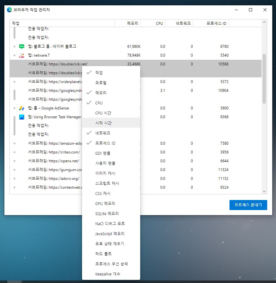 이 정도로 프로세스를 정의하기에 부족하면, '브라우저 작업 관리자' 창 내부를 마우스 오른쪽 버튼으로 누르고 보기 항목 탭을 추가 선택합니다.