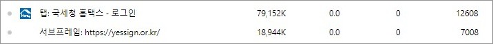 국세청 홈택스에 접속하여 로그인 항목으로 이동하니까 "국세청 홈택스 - 로그인" "탭:", 그리고 '서브프레임' 항목으로 "yessign" 프로세스가 등록되었습니다.