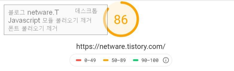 제 티스토리 블로그를 샘플로 하여 기본, 폰트 불러오기 제외, 폰트와 자바스크립트 모듈 불러오기 제외 3가지 유형으로 측정하였습니다. 이 블로그는 Book Club 스킨을 개인이 수정하여 사용하고 있습니다.