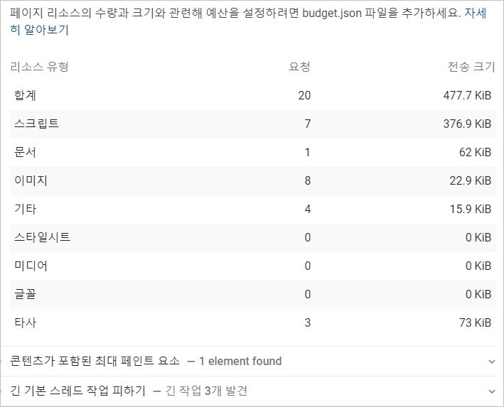 다음 이미지는 페이지 로딩 속도를 측정한 보고서입니다.