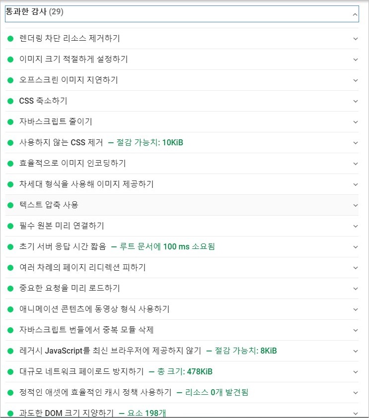 아래 통과한 감사(29) 페이지의 초록색 포인트는 90~100의 점수를 의미합니다. 각 항목의 오른쪽 화살표를 누르면 보다 자세한 보고서 내용을 볼 수 있습니다. 아~주 자세합니다. 연구가 필요한 내용입니다.