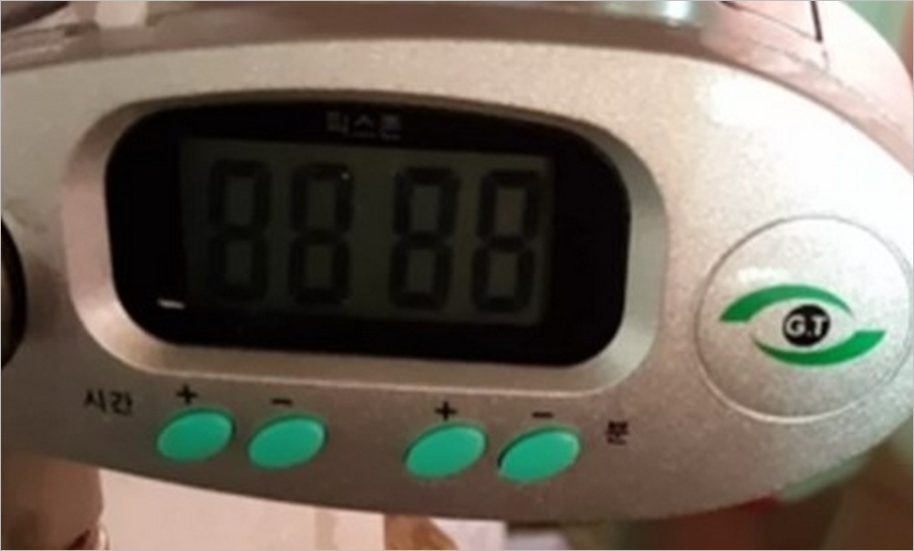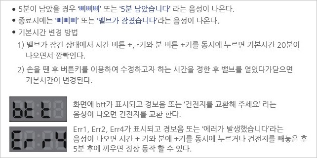 정상적인 경우 배터리 케이스를 분리했다가 다시 끼우면 모터의 진동음이 발생하면서 기기의 사용자 설정 코드가 초기화되어 사용 시간 설정이 20분으로 세팅되고 정상적인 사용이 가능합니다.