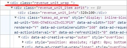 다행스러운 것은 구글 애드센스, 카카오 애드핏 배너 광고의 HTML 코드가 "<div>" 태그를 사용하고 "revenue_unit_wrap"이라는 Class 명칭을 동일하게 적용하였습니다.