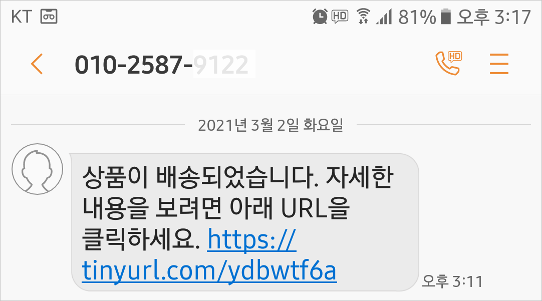 문자 내역: "상품이 배송되었습니다. 자세한 내용을 보려면 아래 URL을 클릭하세요."
