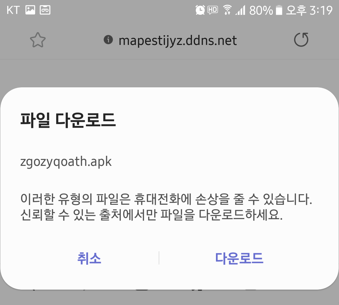 <확인> 버튼을 누르면 안드로이드 계열의 설치 파일인 확장자 APK를 다운로드하게 만드는 링크로 연결하기 때문에 핸드폰에서 보안 팝업창이 뜹니다.