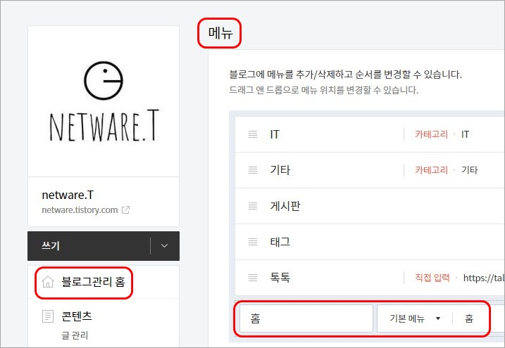 이 상태에서 '블로그관리 홈', '메뉴'에 접속하여 '홈' 링크 버튼을 추가합니다. 그러면 오류 증상이 나타납니다.