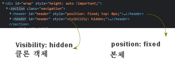 개발자는 'cloneNode()' 메소드(method)를 사용하여 "hidden" 속성을 부여한 'tmp' 임시 객체를 만들어 그 틈을 메웠습니다. 원래 자리로 스크롤 하여 복귀하면 이 객체를 (페이지에서) 지우는 것입니다. 메모리에는 남아 있습니다. 'appendChild()'와 'removeChild()' 메소드가 그 역할을 수행합니다.