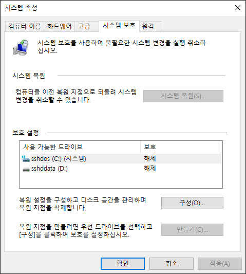 시스템 복원 설정을 통해서 미리 저장해 놓은 복원 지점으로 복구하는 방법도 있습니다.