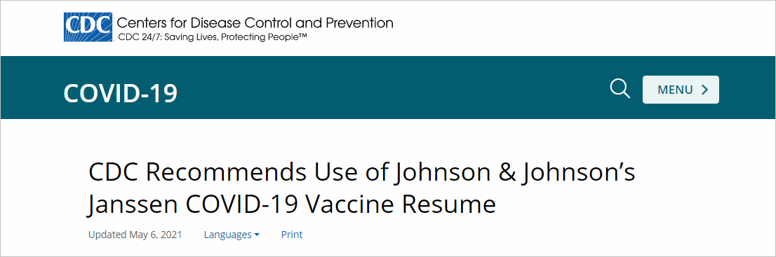 2. Centers for Disease Control and Prevention, "CDC Recommends Use of Johnson & Johnson’s Janssen COVID-19 Vaccine Resume"