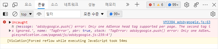 구글 애드센스 광고 코드를 <head> 태그에서 하나만 호출해야 한다는 알림 오류 메시지입니다.