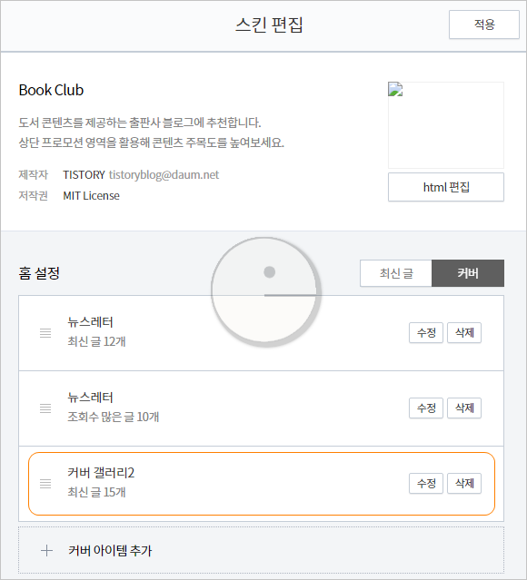 "커버 갤러리2" 아이템의 HMTL 코드 소스는 'skin.html' 파일의 "cover-thumbnail-4"에서 관리합니다.