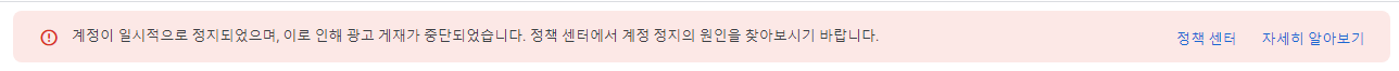 계정이 일시적으로 정지되었으며, 이로 인해 광고 게재가 중단되었습니다. 정책 센터에서 계정 정지의 원인을 찾아보시기 바랍니다. |