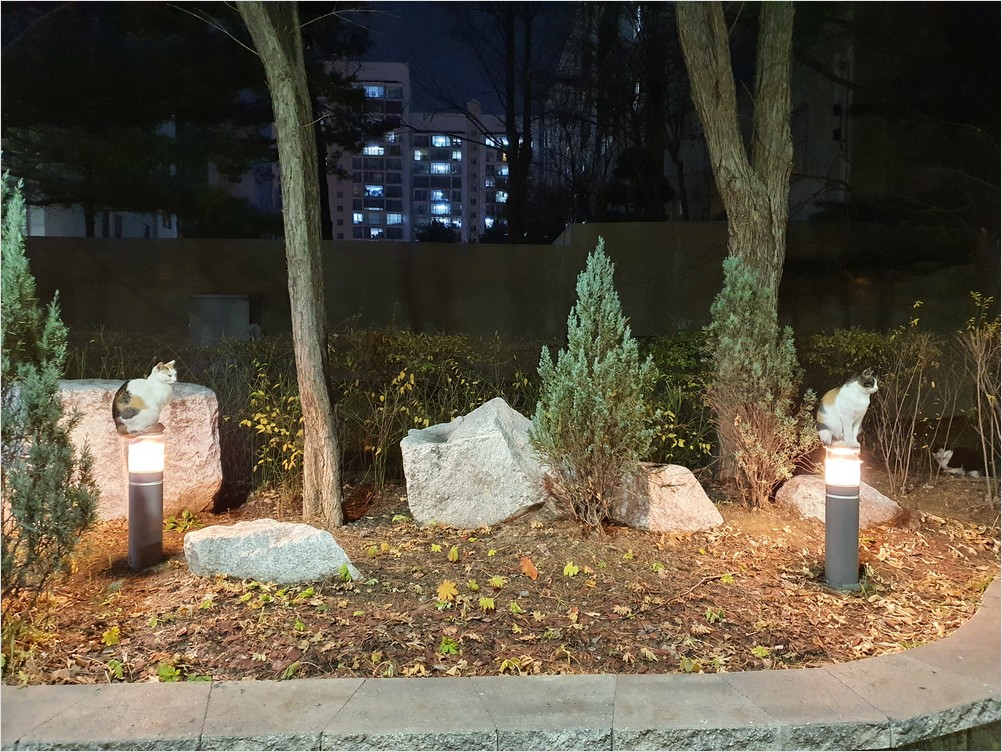 약삭빠른 고양이들이 아파트 단지 주위에 설치된 공원 잔디등을 한 개씩 점유하고 몸을 녹이는 모습입니다. 고양이는 추위에 상당히 약합니다. 피난처를 제 때 마련하지 못하면 위험합니다.