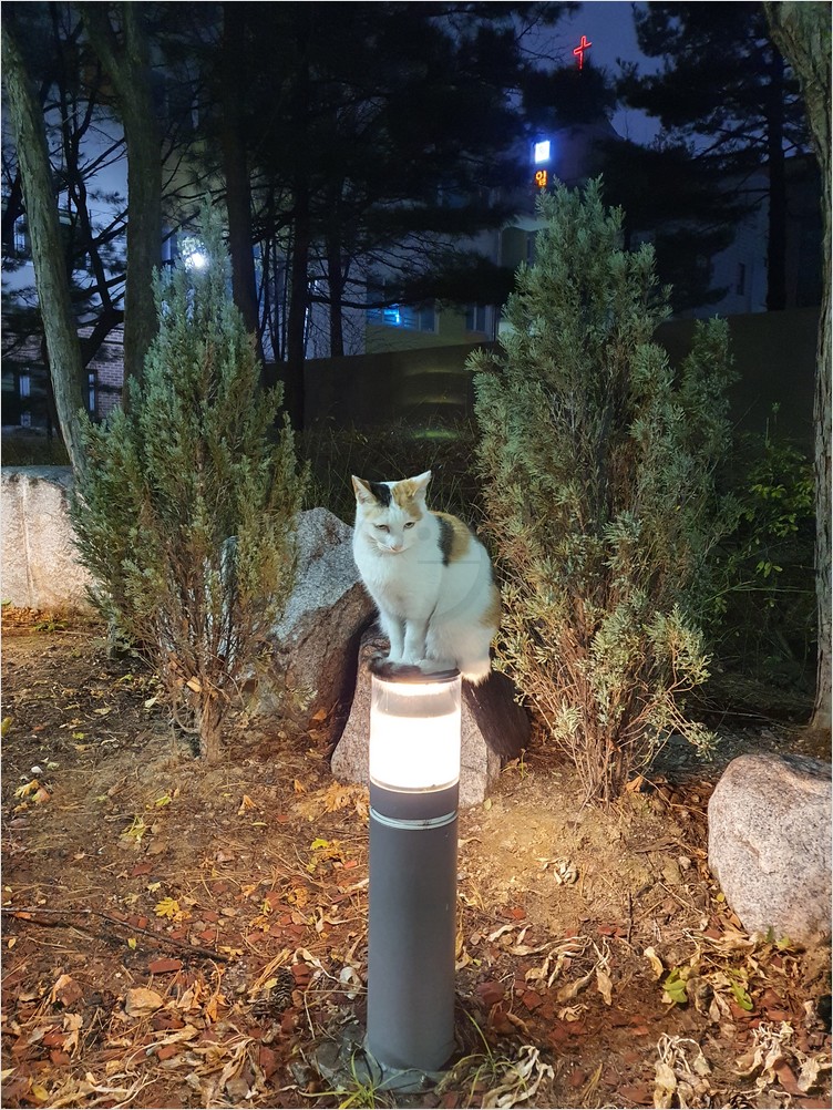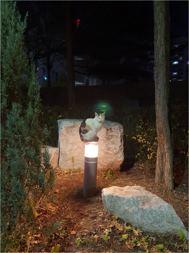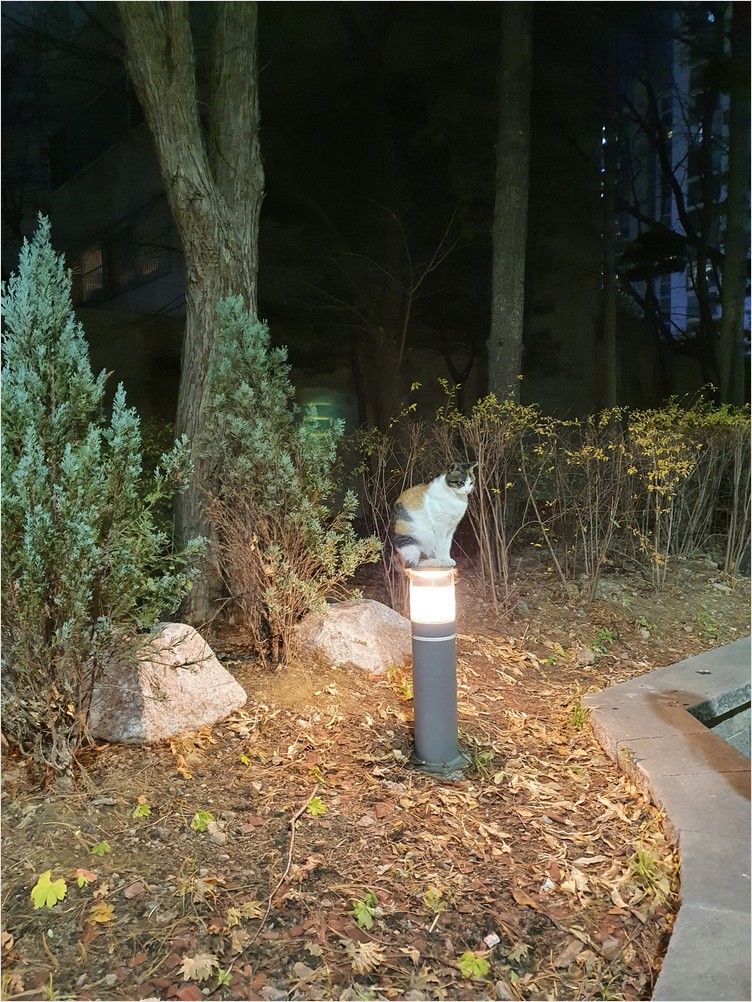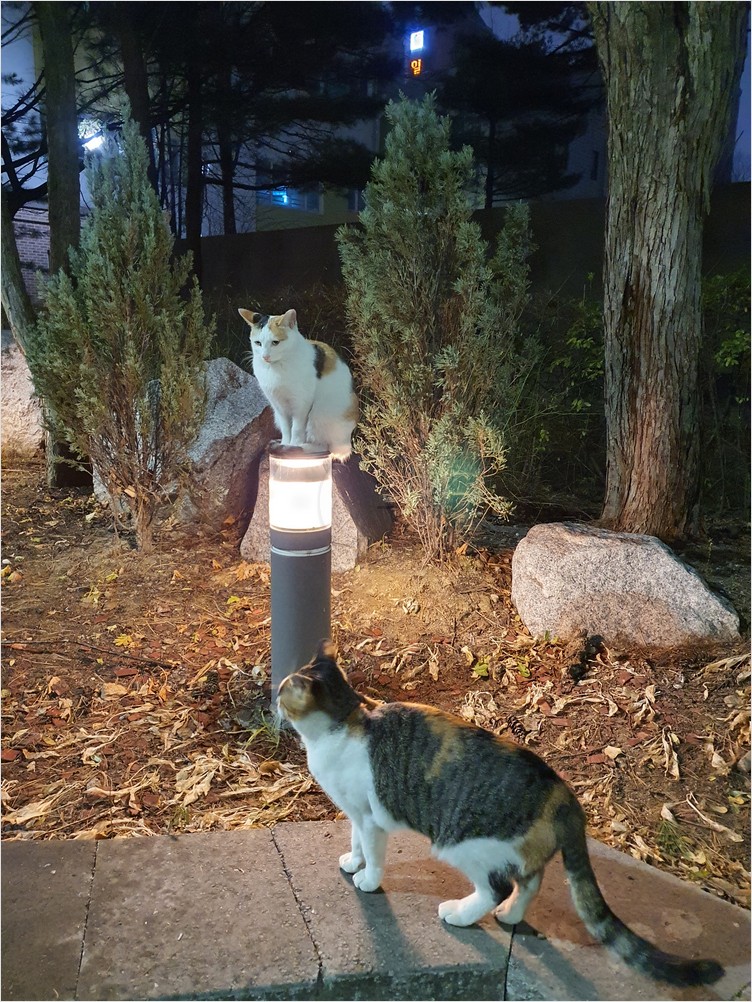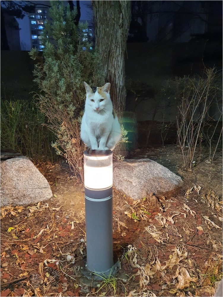 약삭빠른 고양이들이 아파트 단지 주위에 설치된 공원 잔디등을 한 개씩 점유하고 몸을 녹이는 모습입니다. 고양이는 추위에 상당히 약합니다. 피난처를 제 때 마련하지 못하면 위험합니다.