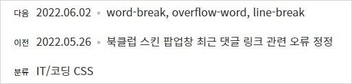티스토리의 스킨 가이드 치환자를 사용한 현재 페이지의 이전 글과 다음 글의 정보 단락입니다. "분류 IT/코딩 CSS"는 현재 글의 카테고리 정보만을 제공할 뿐입니다.