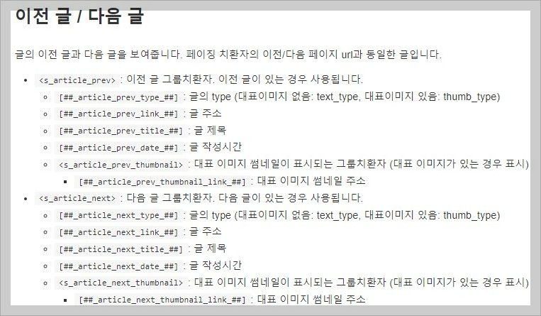 티스토리 스킨 가이드의 "글 치환자" 페이지, "이전 글 / 다음 글" 치환자 설명입니다.