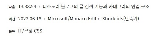 티스토리의 스킨 가이드 치환자를 사용한 현재 페이지의 이전 글과 다음 글의 정보 단락입니다. "분류 IT/코딩 CSS"는 현재 글의 카테고리 정보만을 제공할 뿐입니다.