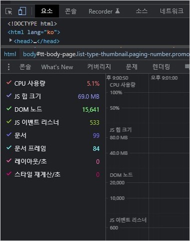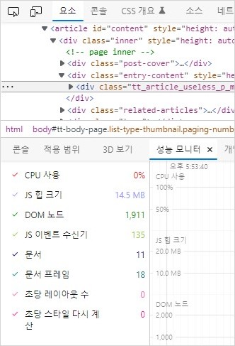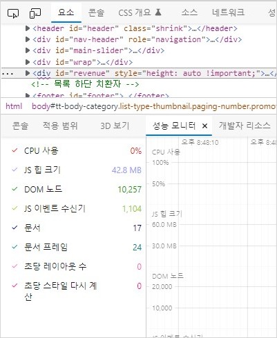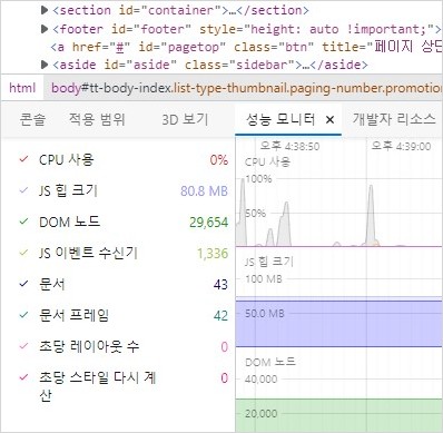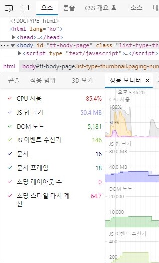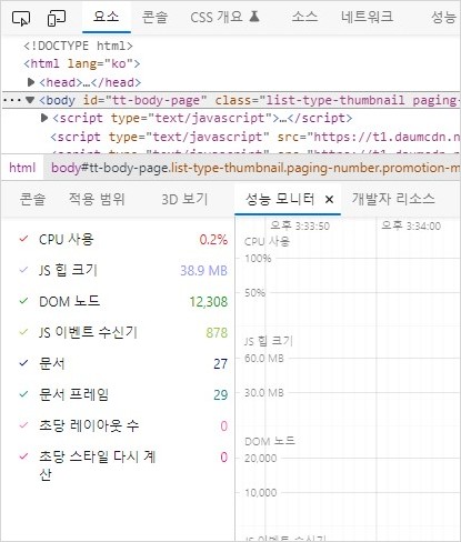 엣지 개발자 도구의 성능 모니터가 제공하는 화면의 각종 정보