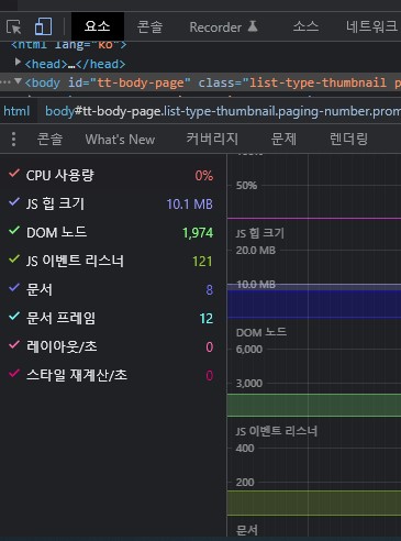 구글 크롬에서도 동일한 증상이 발생하여 DOM 노드가 15,641까지 치솟았습니다. 혹시 메모리가 반환될까 가능성을 고려하여 블로그의 새로운 페이지로 이동하였지만 이동한 페이지가 사용한 만큼의 메모리만 추가될 뿐입니다.