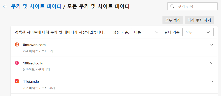 설정 / 쿠키 및 사이트 권한 / 쿠키 및 사이트 데이터 관리 및 삭제 / 모든 쿠키 및 사이트 데이터 보기