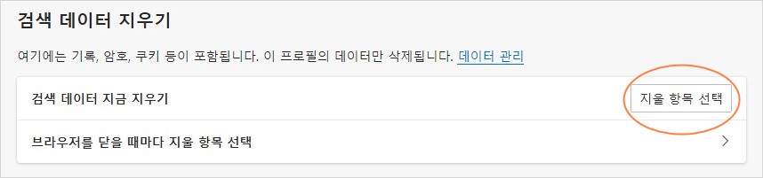 브라우저 / 설정 / 개인 정보, 검색 및 서비스 / 검색 데이터 지우기의 "지울 항목 선택" / "캐시 된 이미지 및 파일"만 선택하고 "지금 지우기" 버튼 누릅니다.