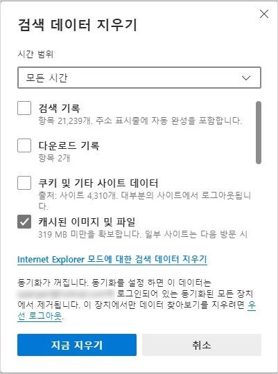 아래와 같이 "사이트 데이터 지우기" 팝업 창 나타납니다.