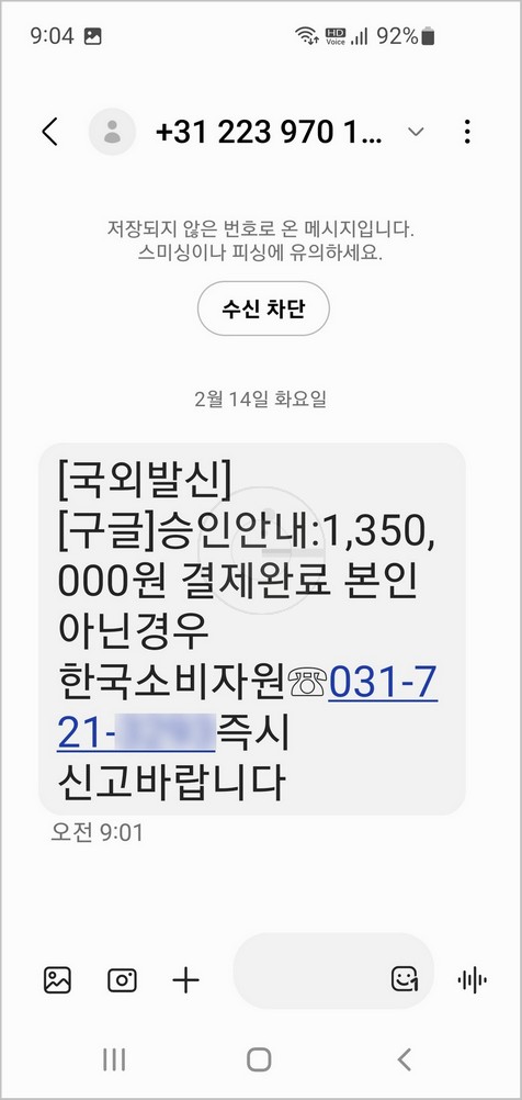 스미싱, smishing은 SMS와 phishing을 합친 합성어로 신조어라고 할 수 있습니다. 문자를 발송하여 사기를 치는 것입니다. 받은 문자는 구글에서 많은 금액이 결제 완료 되었음을 알리는 내용을 담고 있습니다. 추가로, 본인이 결제한 것이 아닐 경우 피해를 막기 위하여 내용에 기재한 신고 전화로 즉시 연락하라는 친절한 안내를 하고 있습니다.