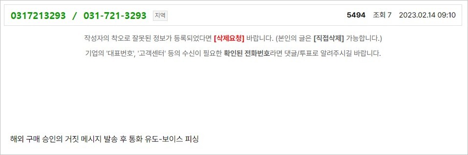 모르는 전화 번호 검색 서비스 업체, 더콜 다수의 이용자가 해당 전화번호를 "해외 구매 승인의 거짓 메시지 발송 후 통화 유도 - 보이스 피싱"으로 등록하였습니다.