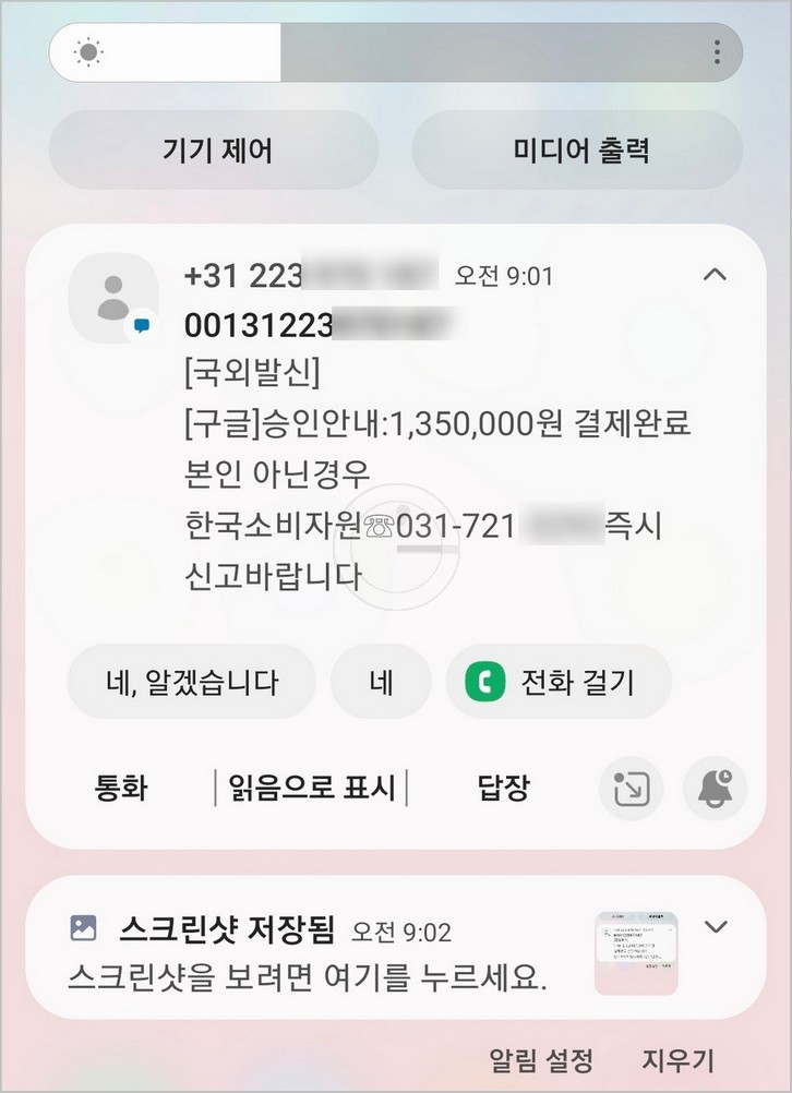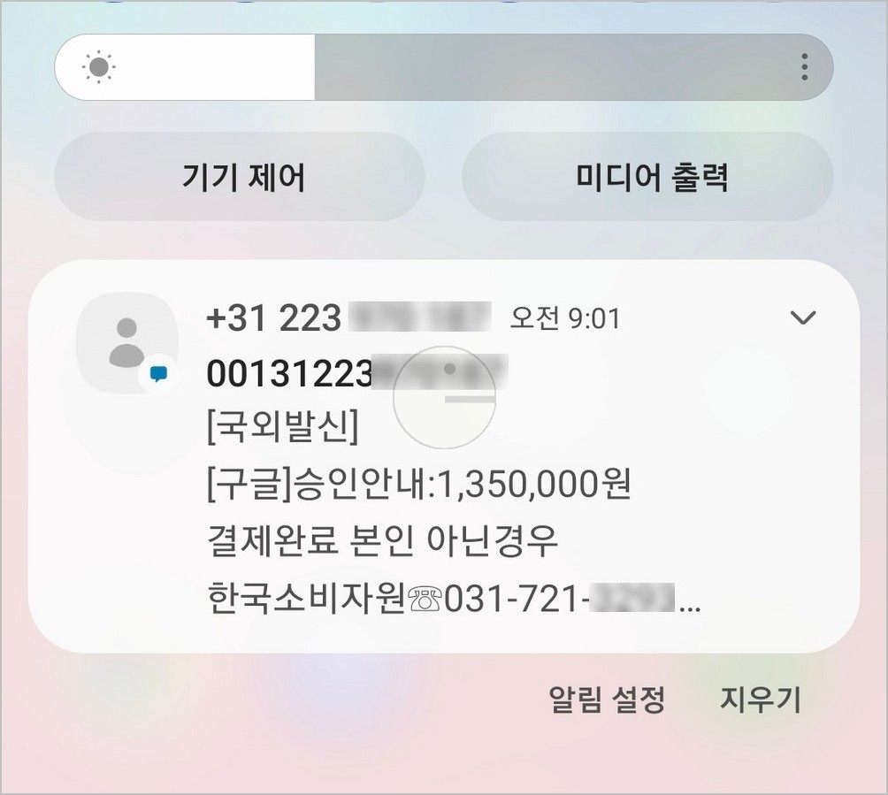 모바일로 문자를 수신하면 위와 같이 스크롤바에 알림 메시지가 등록됩니다. 발송한 전화번호의 앞자리 +31은 문자 하단의 한국소비자원이라 사칭한 전화번호 031과 연결되어 착각을 일으킵니다. 같은 지역 전화번호가 아닌 것이 "[국외발신]" 문자라고 분명하게 명시되어 있습니다.