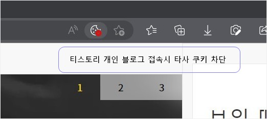 티스토리 접속 후 "타사 쿠키 차단" 버튼 클릭 후 알림 메시지